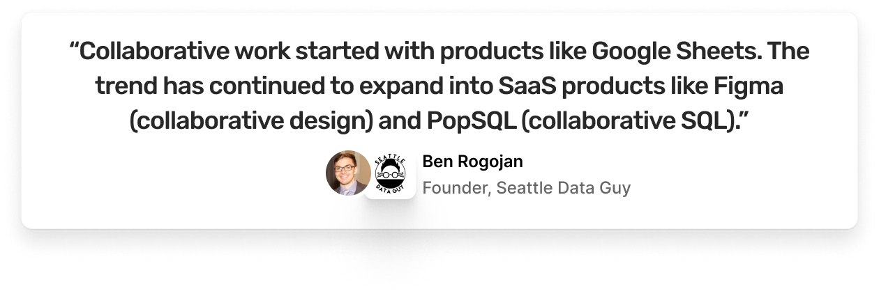 And remember: Even with this massive shift to the cloud, teams still have real-time production databases (MySQL and PostgreSQL being the two most common). Collaborative SQL editors such as PopSQL support all major databases and data warehouses, keeping users in just one tool as opposed to siloed in fragmented tools.